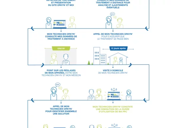 La réussite de votre traitement de l'apnée du sommeil à domicile par ventilation à pression positive continue (PPC) repose sur votre adhésion et votre observance au traitement. En synergie avec votre médecin, ORKYN' vous accompagne ainsi que votre entourage à la bonne compréhension de votre traitement par pression positive continue. Ce suivi s'articule autour d'un programme unique qui propose un suivi rapproché avec un technicien respiratoire qui vous sera dédié pendant les premiers mois de l'initiation de votre traitement de l'apnée du sommeil.